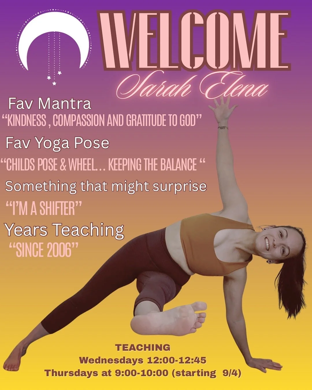 Hi, I’m Sarah Elena. I’ve been teaching and nourishing students since 2006, and over the years my practice has become this beautiful blend of storytelling, real-life lessons, and a heart-centered focus. Yoga, for me, is less about perfect poses and more about creating space for connection—to ourselves, to each other, and to the present moment.